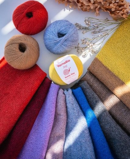 Product knitters can try knitting with an open gauge (think larger needles and more open stitches) to experiment with the yarn weight. You’ll end up with a drapey finished product that is lightweight and breezy. Carrying a strand of Joy lace weight yarn together with another yarn is another option; it can not only add to the thickness of the fiber but also enhance the project’s color and depth.